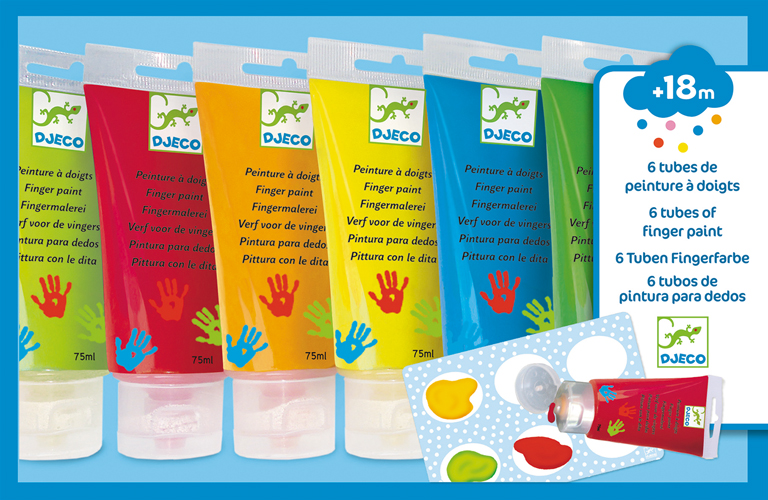 set di 6 barattoli di colori a dita, per momenti di espressione artistica a tutto corpo a partire dai 18 mesi.
