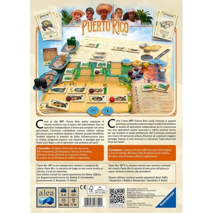 Siamo nell’anno 1897. Porto Rico cerca di riorganizzarsi per il mondo moderno e di lasciarsi alle spalle l’era del colonialismo. I giocatori si calano nei ruoli di agricoltori portoricani che competono per assumere lavoratori, coltivare lo zucchero e il tabacco, vendere merce preziosa e per creare un’importante infrastruttura cittadina. Vince l’agricoltore che riesce a ottenere più prestigio