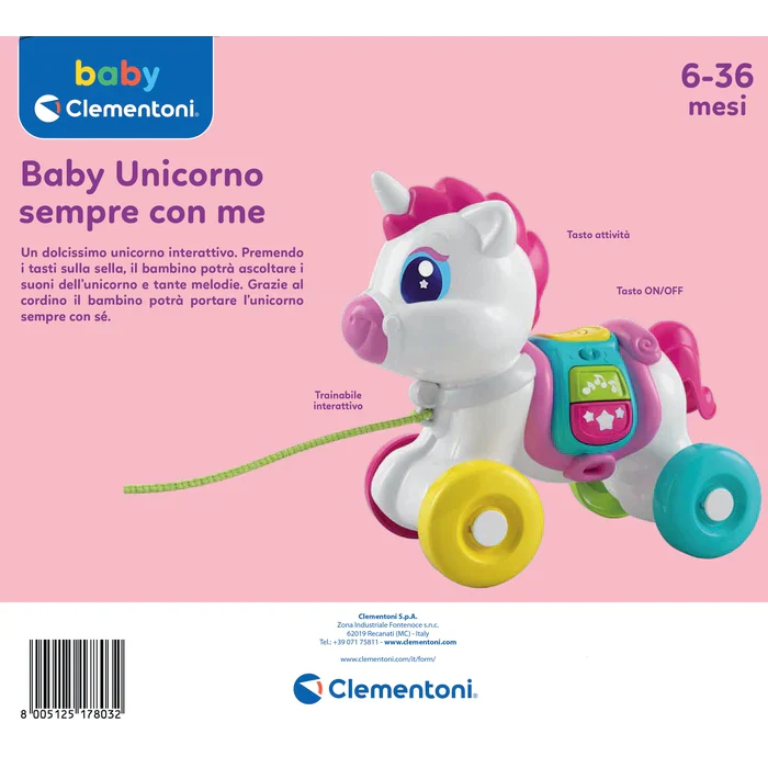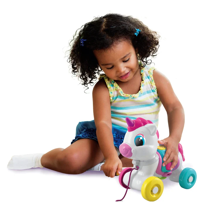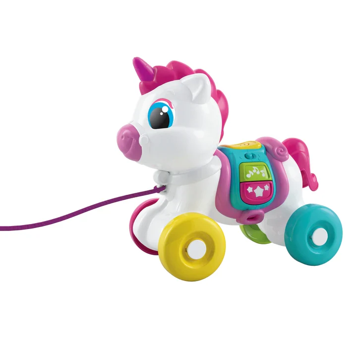 Grazie ai tasti interattivi, alle ruote ed il cordino, l’unicorno supporta lo sviluppo sensoriale, motorio e del linguaggio.