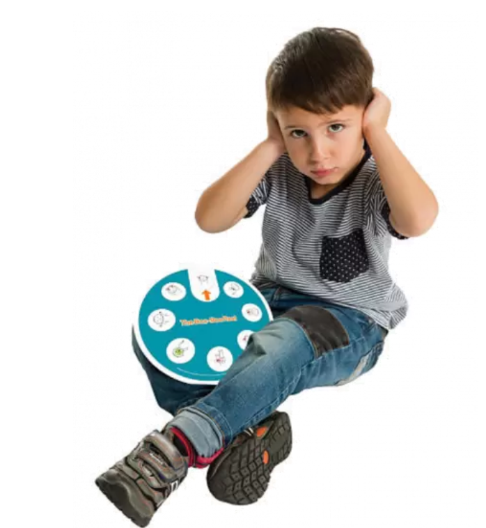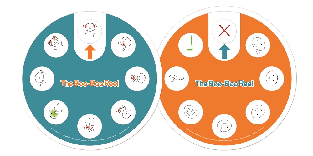 Rotella a due facce (fronte-retro) pensata per bambini e adulti non verbali o con difficoltà comunicative: mostrami dove ti fa male e come ti senti.