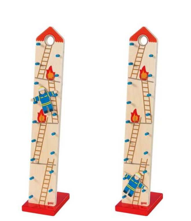 Un gioco in legno causa-effetto semplice ma avvincente: appoggia il pompiere in cima alla scaletta e osservalo mentre “scivola” giù lungo i pioli.