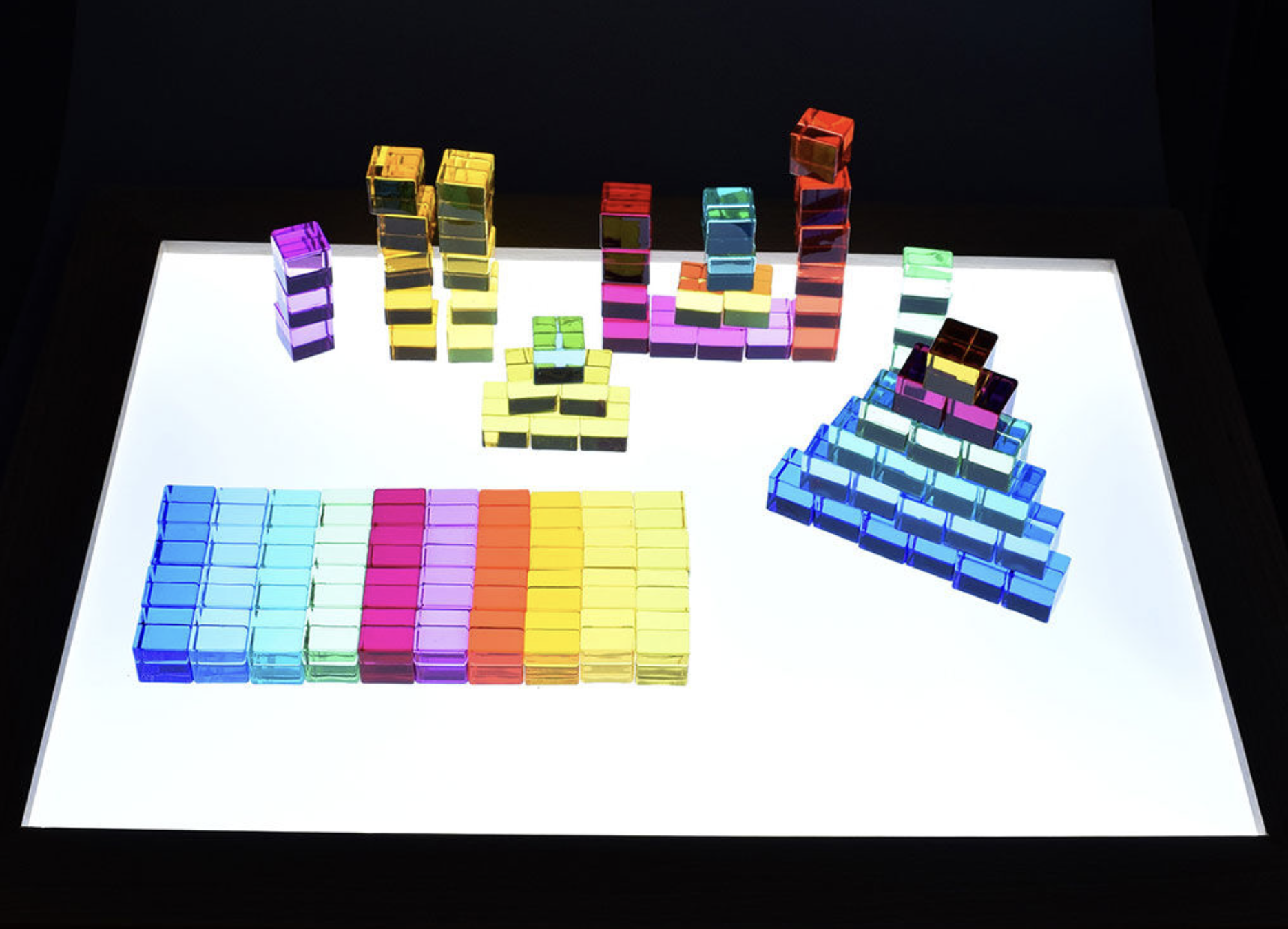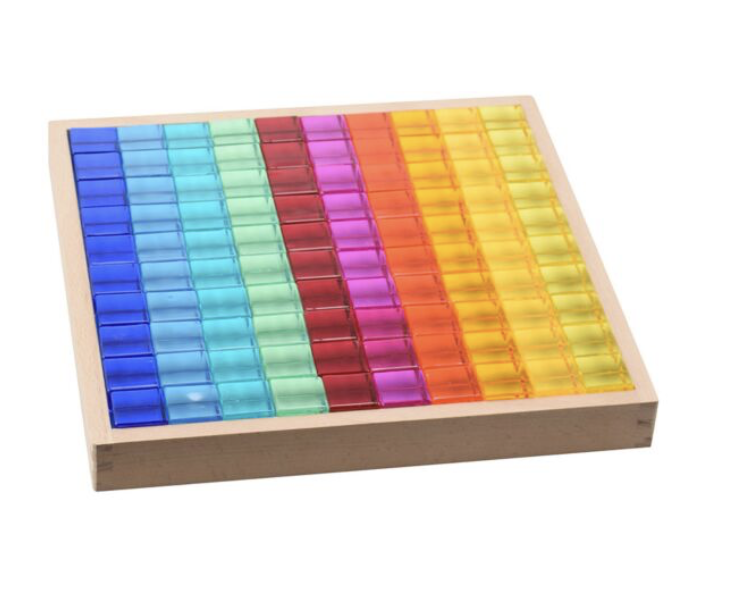set di 100 cubi in acrilico colorato, dentro ad una cornice di legno. Questo set è ideale per giocare con la luce, in particolare sulla tavola luminosa o in sala snoezelen: i cubi sono di 2,5cm per lato, di 10 colori diversi. Non adatto al di sotto dei 3 anni