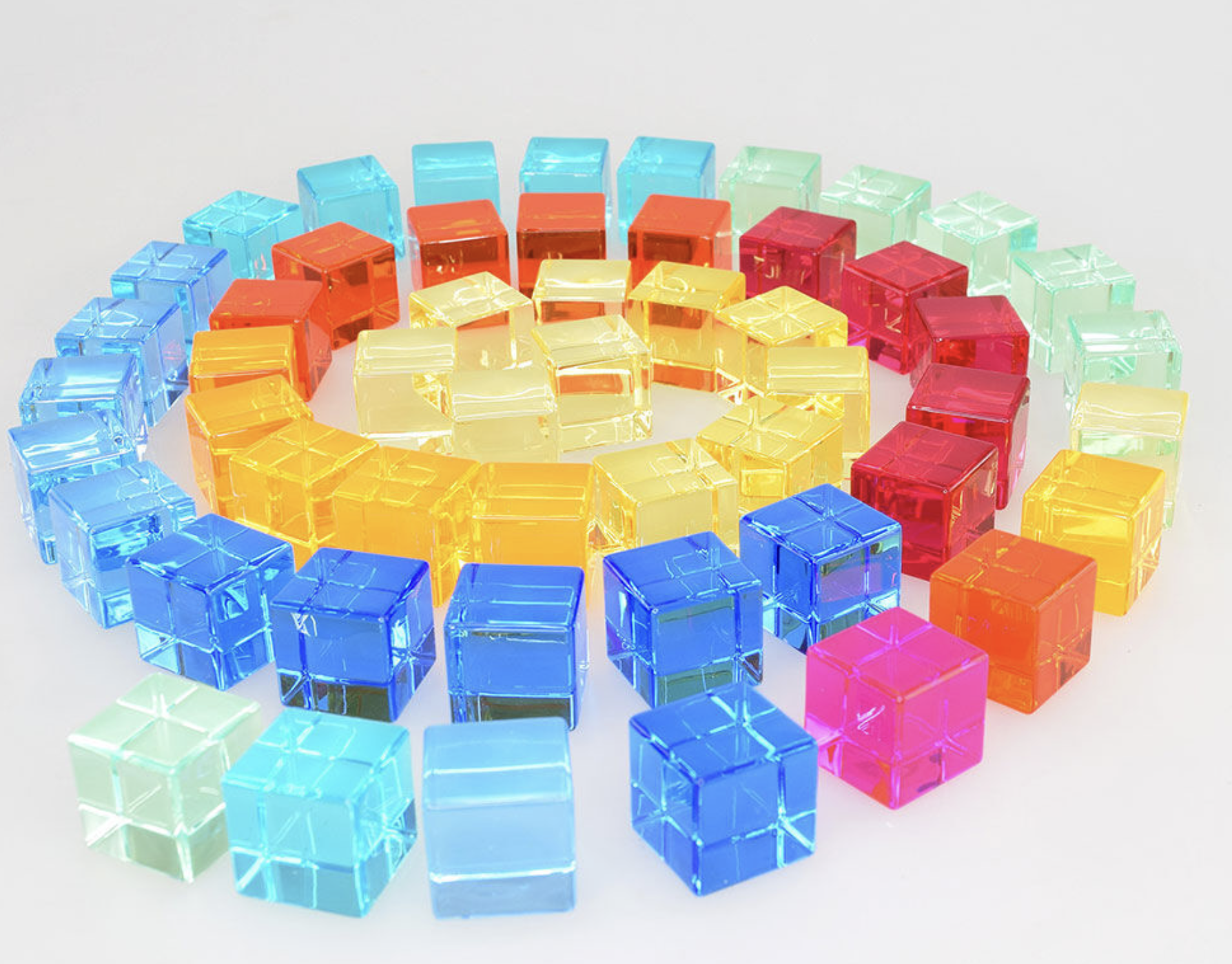 Questo set è ideale per giocare con la luce, in particolare sulla tavola luminosa o in sala snoezelen: i cubi sono di 2,5cm per lato, di 10 colori diversi.