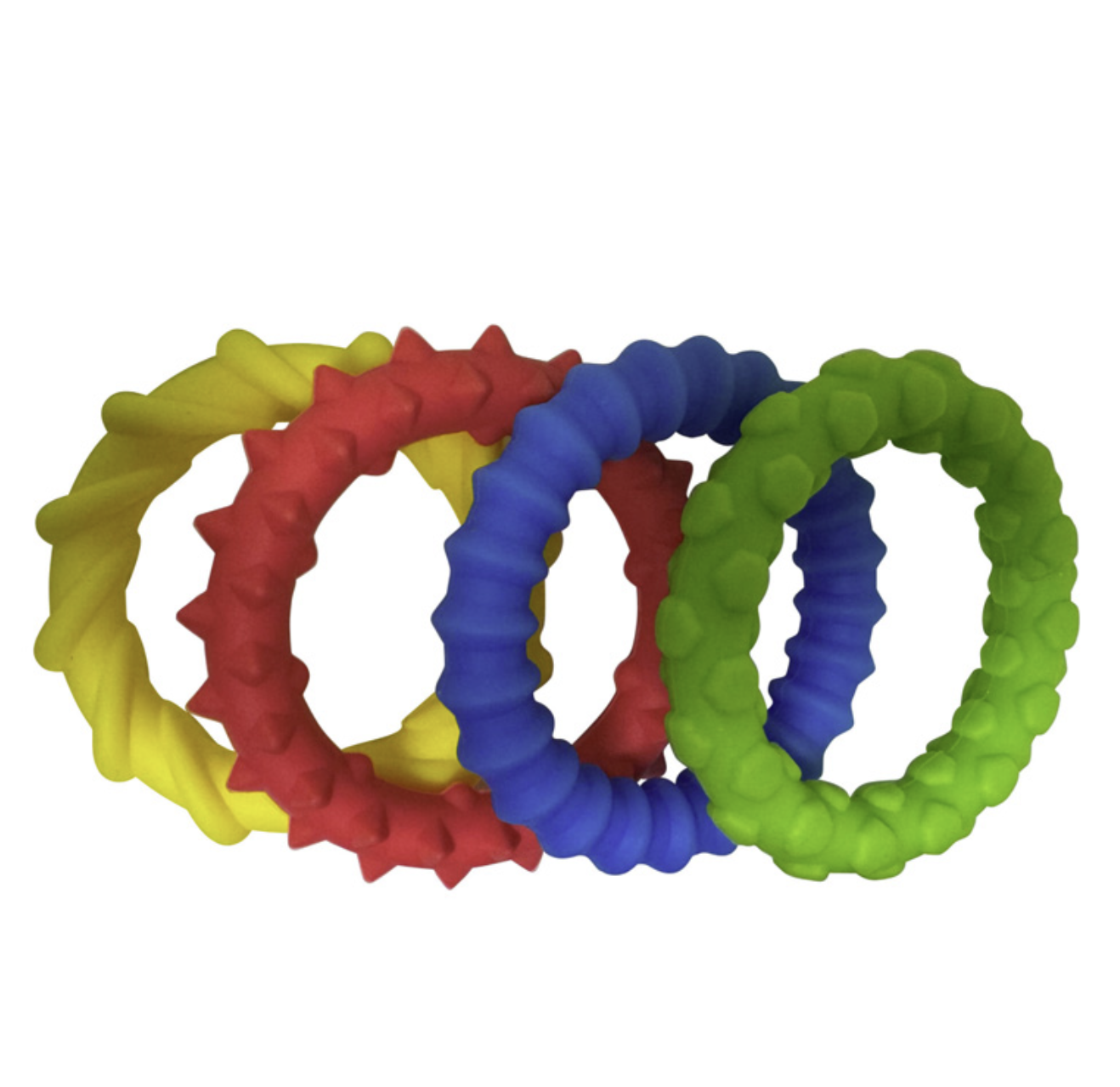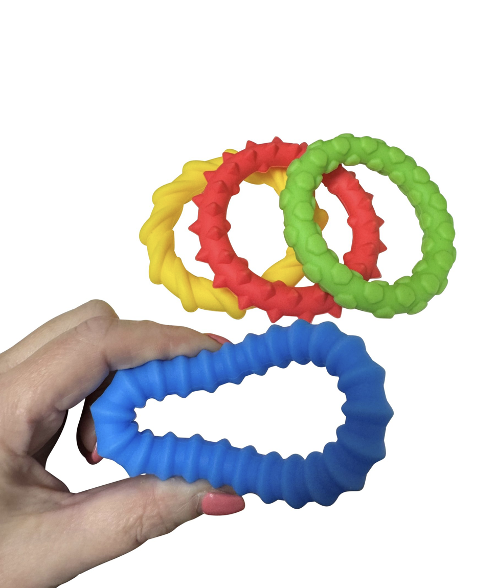 Set di 4 anelli gommosi con texture diversi: fidget ideali per la classe, grazie alla presenza discreta e silenziosa.