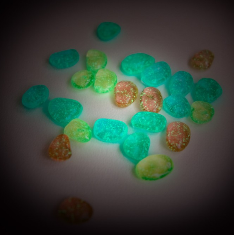 set di pietrine fosforescenti, ideali per giocare con la luce: si caricano ancora più facilmente utilizzando la torcia UV.
