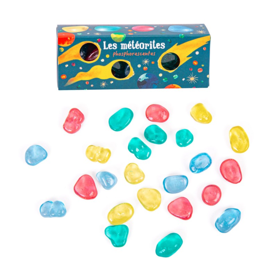 set di pietrine fosforescenti, ideali per giocare con la luce: si caricano ancora più facilmente utilizzando la torcia UV. Le pietrine, in più colori, sono decorate al loro interno da tantissime goccioline di materiale in grado di immagazzinare la luce per alcuni istanti. Contenute in una pratica confezione di cartone.