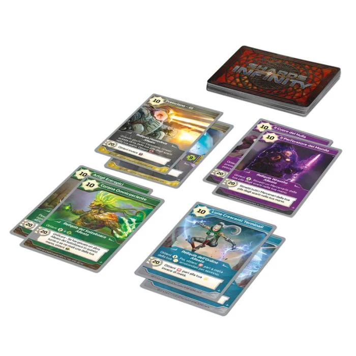 Elementi di Gioco: 24 carte del mazzo centrale dal bordo nero, 8 carte Reliquia dal bordo grigio.