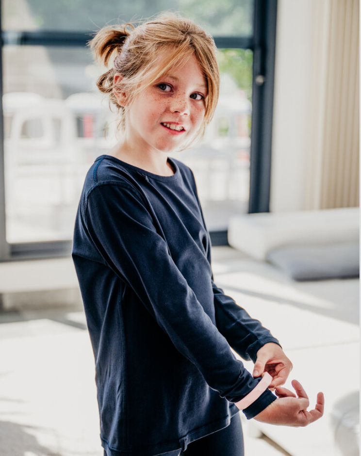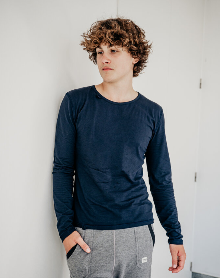 Per bambini e ragazzi con difese tattili elevate, trovi in diverse taglie questa t-shirt di colore blu scuro.