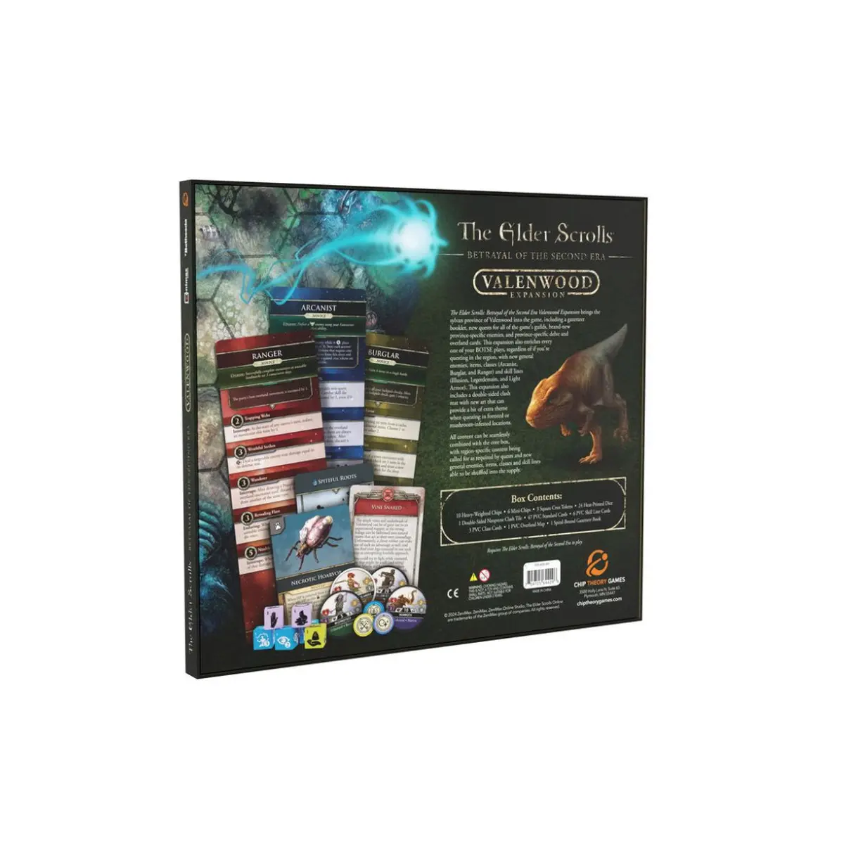 The Elder Scrolls: Betrayal of the Second Era Valenwood Expansion introduce la provincia silvana di Valenwood nel gioco, includendo un opuscolo informativo, nuove missioni per tutte le gilde del gioco, nuovi nemici specifici per ogni provincia e carte delve e overland specifiche per ogni provincia. Questa espansione arricchisce inoltre ogni vostra partita BOTSE , indipendentemente dal fatto che stiate svolgendo missioni nella regione, con nuovi nemici generici, oggetti, classi (Arcanista, Ladro e Ranger) e linee di abilità (Illusione, Prestidigitazione e Armatura Leggera). Questa espansione include anche un tappetino scontro bifacciale con nuova grafica che può fornire un tocco di tema in più durante le missioni in luoghi boschivi o infestati da funghi.
