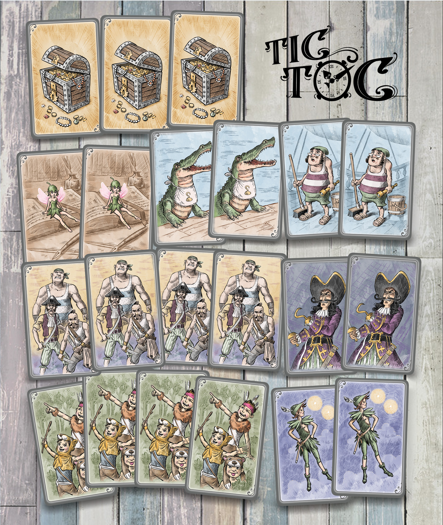 18 Carte Bimbi Sperduti, 18 Carte Ciurma, 4 Carte Campanellino, 4 Carte Tic Toc, 4 carte Peter Pan, 4 Carte Capitan Uncino, 4 Carte Spugna, 8 Carte Tesoro.