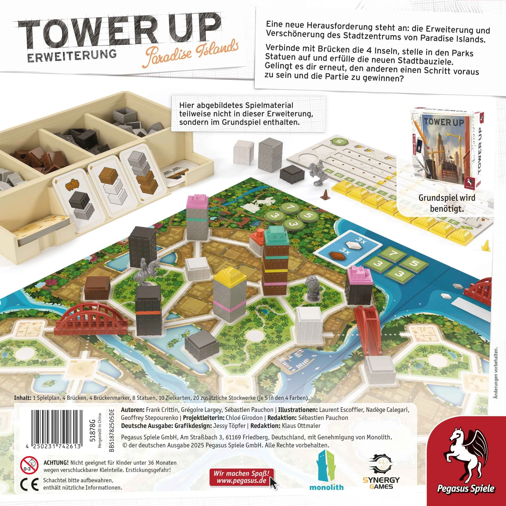 Dopo aver completato la costruzione in città, la tua azienda si sta espandendo fino alla costa. È tempo di costruire ponti per collegare le isole, e non dimenticare le statue! Pianificazione e tattica saranno ancora le tue migliori risorse per sconfiggere i tuoi avversari in Tower Up: Paradise Islands , la prima espansione del gioco Tower Up .