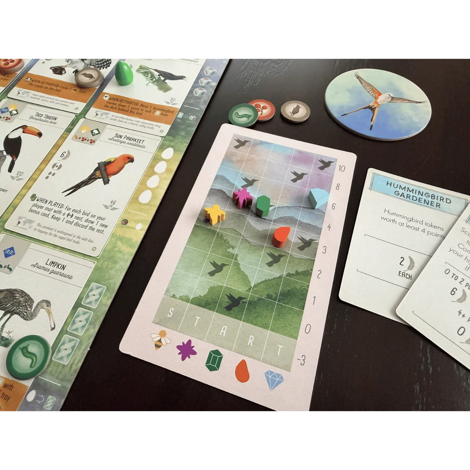 I colibrì costituiscono circa un decimo delle specie di uccelli dell’America Latina, deliziando gli amanti degli uccelli con i loro movimenti rapidi e le piume scintillanti. La designer Elizabeth Hargrave e le artiste Natalia Rojas, Ana Maria Martinez Jaramillo e Martha Clare li mettono in risalto in questa espansione con un nuovo tipo di carta che aggiunge un tocco di novità al gameplay.