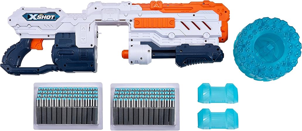X-Shot Exel Turbo Advance 96 dardi Pronto ad epiche sfide con gli amici con Exel Turbo Advance, il super blaster con gettata fino a 24m e caricatore rotante! Comprende un totale di 96 dardi X-Shot. Funzionamento ad aria compressa